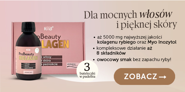 Kolagen, to produkowane przez organizm białko, które jest budulcem skóry, kości, zębów, ścięgien, chrząstek, naczyń krwionośnych. Niestety wraz z wiekiem obniża się zdolność organizmu do produkcji kolagenu. Z tego powodu KONIECZNE jest jego uzupełnianie. Niestety dostarczenie go z pożywienia jest trudne. Natomiast produkty w niego bogate jak np. galaretki nie dostarczają nam kolagenu odpowiedniej jakości. Żeby kolagen faktycznie zadziałał na skórę, musi być podawany w dawce około 5000 mg przez okres 3-4 miesięcy. Powinien to być kolagen rybi typu I, który ma strukturę podobną do kolagenu ludzkiego oraz cechuje się wysoką przyswajalnością. Ważne jest, żeby kolagen przyjmować w towarzystwie witaminy C i kwasu hialuronowego. Stymulują one dodatkowo produkcję kolagenu – tak jak ma to miejsce w produkcie ProBeauty.