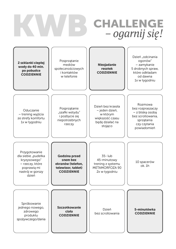 Robię to wyzwanie, bo poprzednie KWB WINTER CHALLENGE totalnie mnie zmieniło, nawet w obszarach, których nigdy bym się nie spodziewała! Z tego, co czytałam w komentarzach – Ciebie też ruszyło, zmieniło i pomogło zobaczyć różnicę!