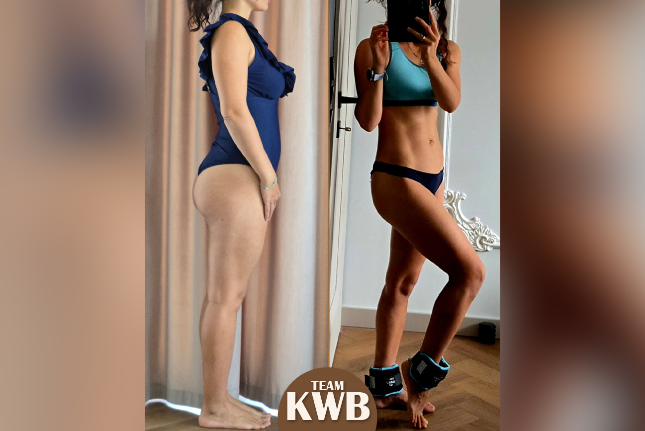 Ma 38 lat i trójkę dzieci w wieku 5 i 4 lat oraz rocznego maluszka. Pracuje na siedząco, a mimo zmęczenia od ponad 14 lat zawsze znajdowała czas na treningi – również w ciąży. Przez lata wydawało jej się, że „więcej już się nie da”. Aż do chwili, gdy zaczęła obserwować społeczność KWB i historie kobiet, które odważnie wprowadzały zmiany we własnym tempie.